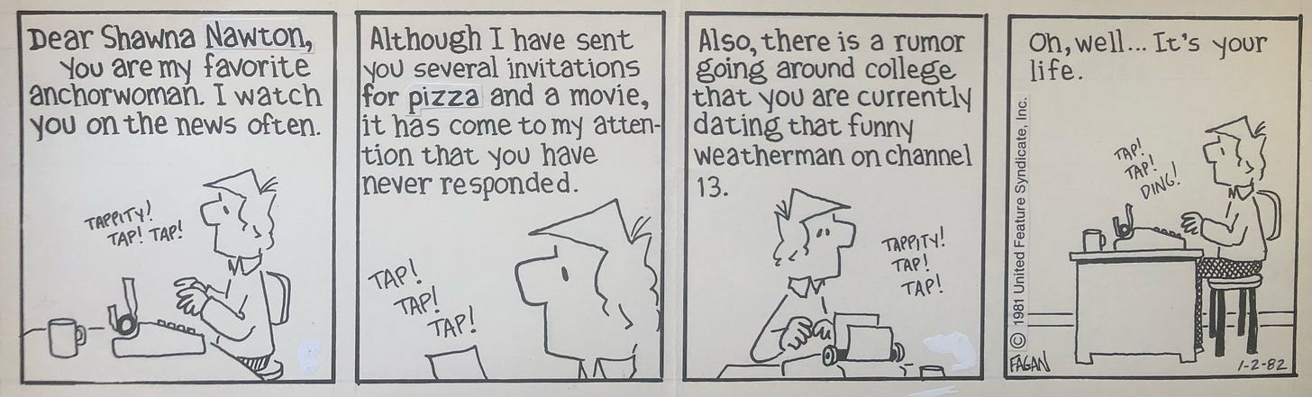 Happy New Year, Kevin et al! Norm typing a letter on a typewriter to his anchor woman crush is really great! Was there a reoccurring gag of Norm having a crush on the anchor woman? When I was young I had a crush on the woman who used to draw the powerball numbers on TV every week haha!